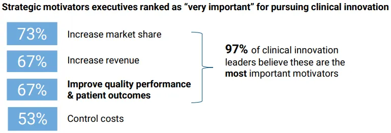 By nature, health systems are compelled to adopt clinical innovations that can meaningfully improve care delivery and health outcomes. But tight financial circumstances and the significant costs involved means there is an increased pressure to focus on innovations that enable long term financial growth by growing their market share and increasing revenue in addition to improving quality and health outcomes. Therefore, health systems will likely focus on innovations that enable their strategic motivators (e.g., market differentiation, revenue growth, etc.) or align with a broader organizational strategy (e.g., value-based care, health equity, etc.)