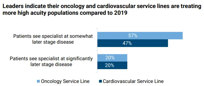 Service line growth decisions are guiding investment strategy. Leaders reported that they are prioritizing cardiovascular, oncology, and neurology service lines. Therefore, their investment decisions are tied to innovations supporting these service lines like gene therapy, genomic testing, and advanced immunotherapy. All of these investments are important as these service lines are seeing patients needing higher acuity care compared to five years ago. To keep cost-per-case under control, many are trying to pursue innovations focused on earlier detection and preventative care.
