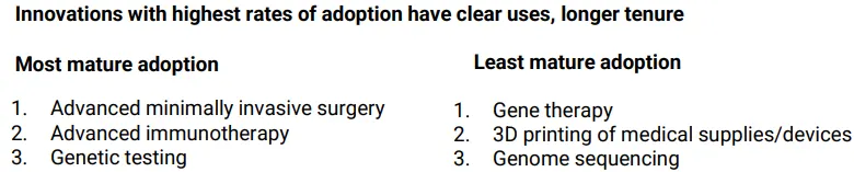Leaders indicated the highest confidence in the most broadly adopted innovations, (e.g., advanced minimally invasive surgery, advanced immunotherapy, and genetic testing), because of their clear use cases, ability to enable growth strategies (e.g., ambulatory and service line growth), and fewer risks. Clinical applications of AI is a notable exception, where its substantial use cases and potential to enable growth and contain costs has leaders confident in its impact despite its nascent use in healthcare delivery. Conversely, 70% of clinical leaders on average stated they were “neutral” or only “somewhat convinced” about the overall impact of less commonly adopted innovations like gene therapy, 3D printing of medical supplies/devices, and genome sequencing which have fewer use cases than AI and less mature industry adoption than advanced minimally invasive surgery.