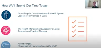 Join The Health Management Academy’s Vice President Robin Brand, Associate Director Joseph Leonard, and Analyst Calla Slayton for an exclusive webinar revealing our new research on the landscape of PT and how leading health systems are leveraging PT to drive growth, reduce leakage, and strengthen their ambulatory network.